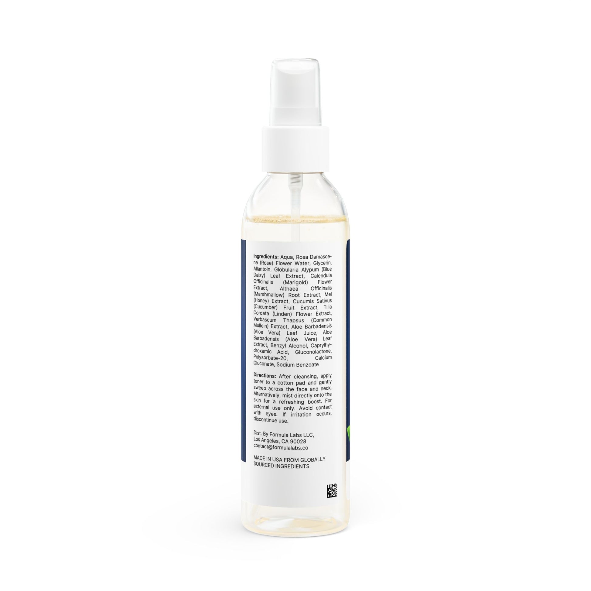 Ingredients: Aqua, Rosa Damascena (Rose) Flower Water, Glycerin, Allantoin, Globularia Alypum (Blue Daisy) Leaf Extract, Calendula Officinalis (Marigold) Flower Extract, Althaea Officinalis (Marshmallow) Root Extract, Mel (Honey) Extract, Cucumis Sativus (Cucumber) Fruit Extract, Tilia Cordata (Linden) Flower Extract, Verbascum Thapsus (Common Mullein) Extract, Aloe Barbadensis (Aloe Vera) Leaf Juice, Aloe Barbadensis (Aloe Vera) Leaf Extract, Benzyl Alcohol, Caprylhydroxamic Acid, Gluconolactone, Polysorbate-20, Calcium Gluconate, Sodium Benzoate.